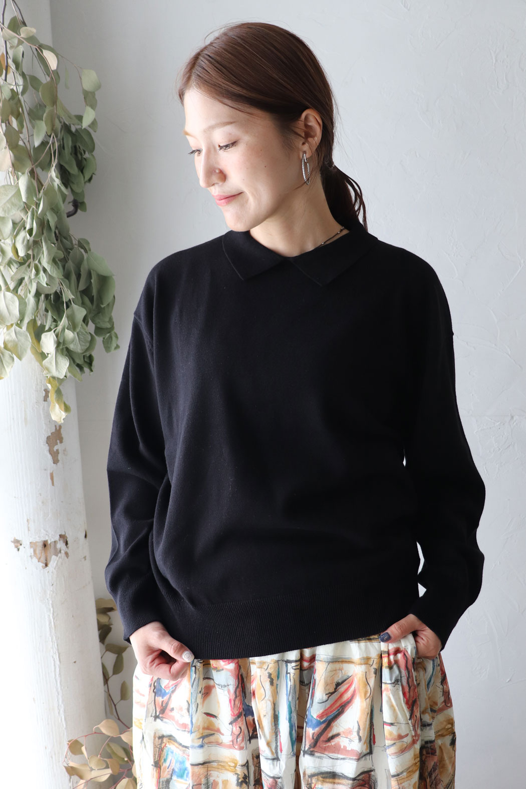 やわらかな風合いのコットン糸を使用したプルオーバー。 小さめの衿がフェミニンでクラシックな雰囲気に* ゆったりとした身幅ですが、裾のリブがシルエットを引き締めてくれます。 パンツともスカートとも相性良く、着回し力の高さも魅力〇