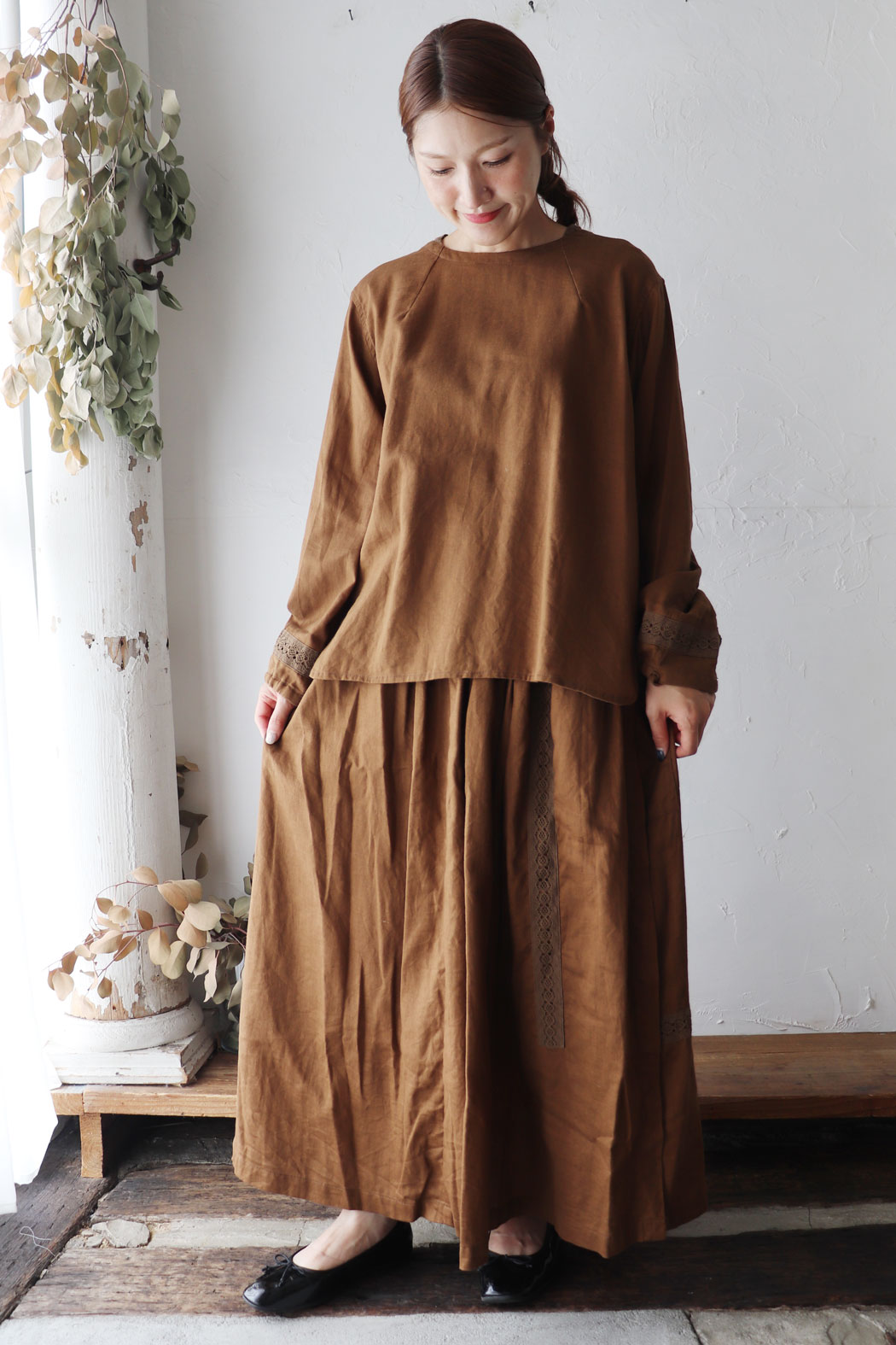 コットンリネンの薄手ビエラ生地を使用したVlas Blommeのレース付きスカート。柔らかな落ち感と同色レースが上品なアクセントに。