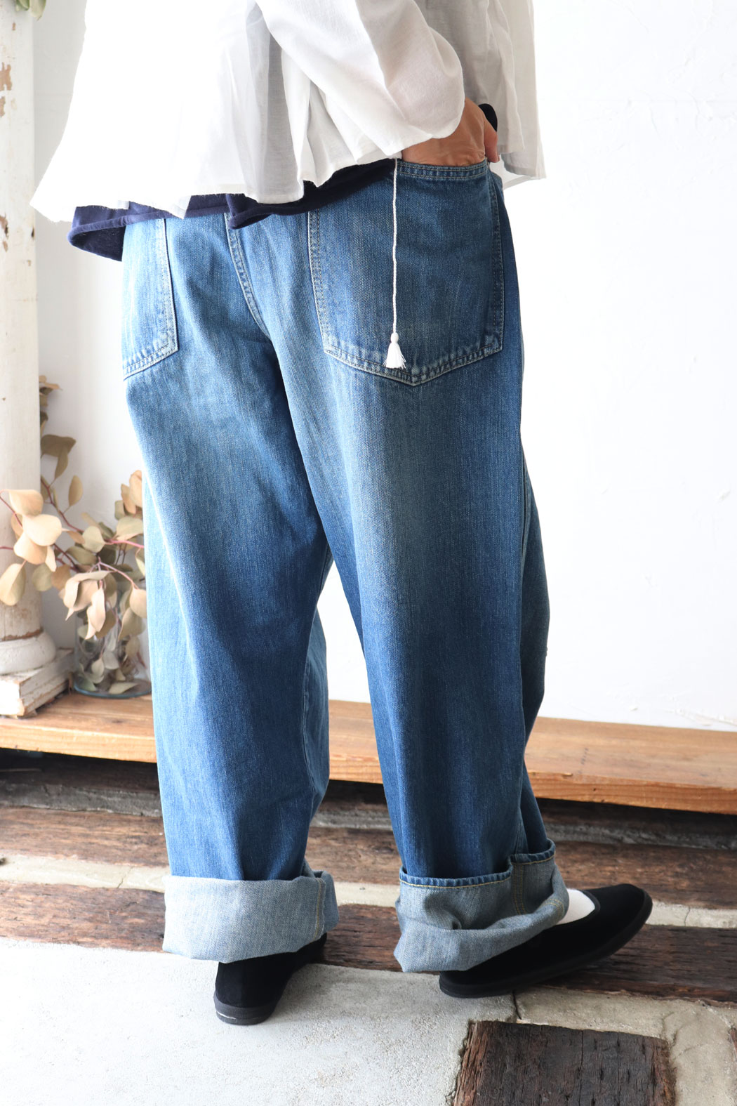 手紡ぎ・手織りのカディ仕立てのコットンツイル生地を使用したカシュクールシャツ。 衿元にはフリルをプラスし、さりげない可愛らしさを加えました* 前を閉じての着用はもちろん、カーディガン感覚で羽織るだけでも雰囲気のあるスタイリングに〇 紐の先についたタッ...