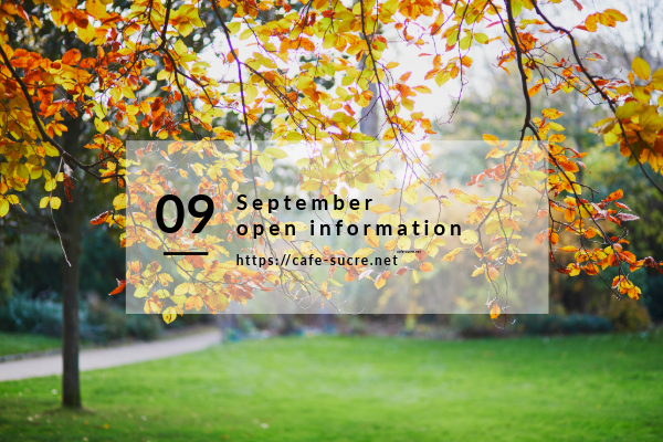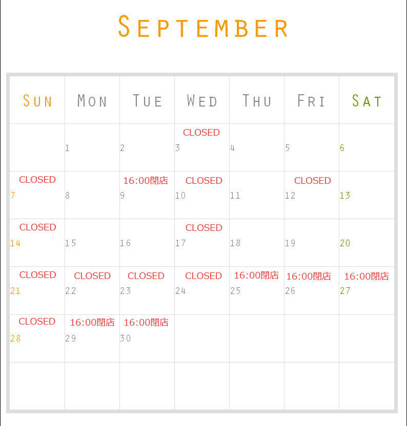 ◆ 9/12(金)、9/22(月)、9/23(火) は臨時休業。