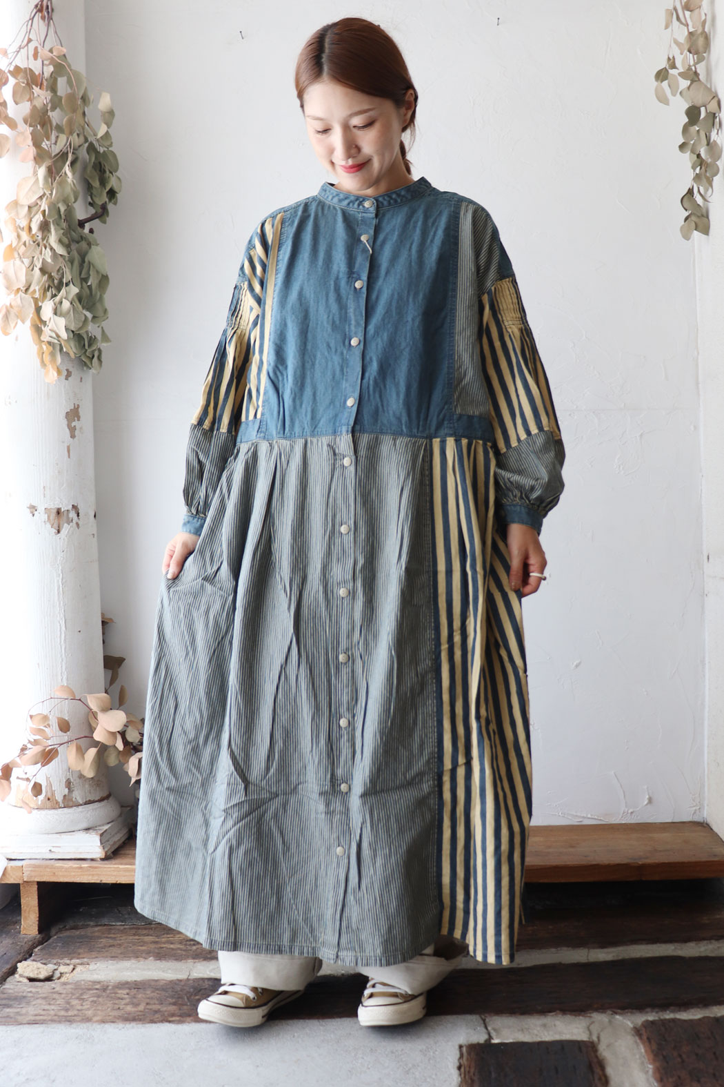 デニム生地と太めのストライプ生地を組み合わせたワンピース。 オーバーダイ加工を施し、風合い豊かに仕上げました* 薄手で軽い生地なので、長い季節着回していただける1着〇 ウエストと袖にギャザーを入れる事で、シルエットに変化を加えました。