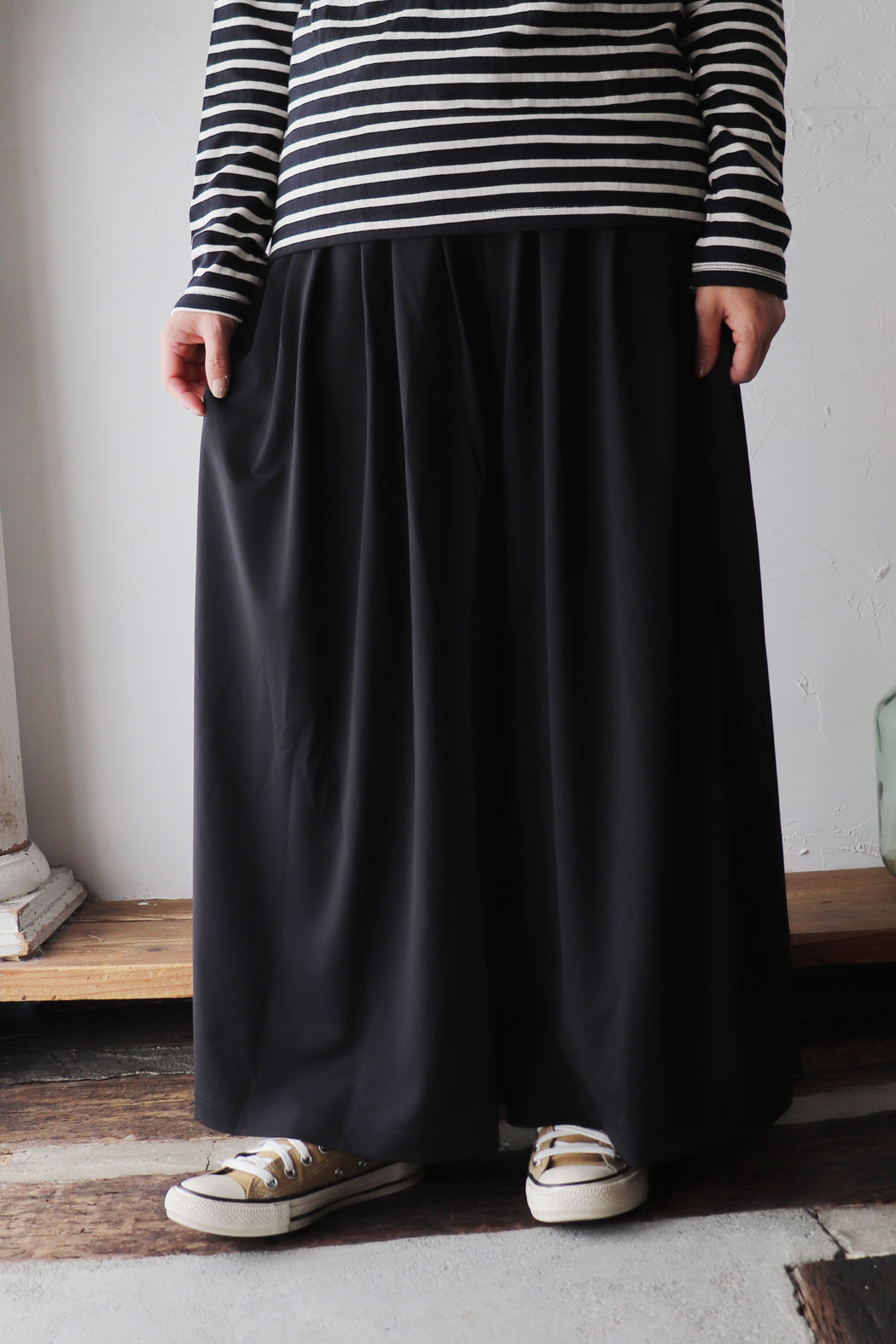 まるでスカートのようなボリュームが魅力のワイドパンツ。 細かくギャザーを入れて、ふんわりとしたシルエットに* 薄くて軽やかですが、透け感はなく、1枚で安心して着用いただけます。 ウエストはゴムと紐で調節出来、リラックスした穿き心地に〇