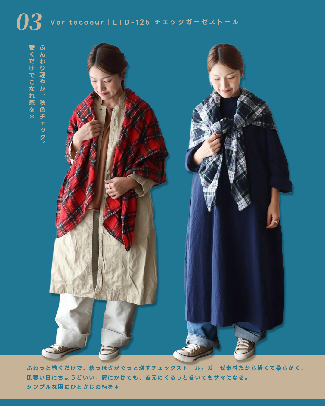秋の装いに欠かせないチェック柄。Veritecoeurのガーゼストールは、