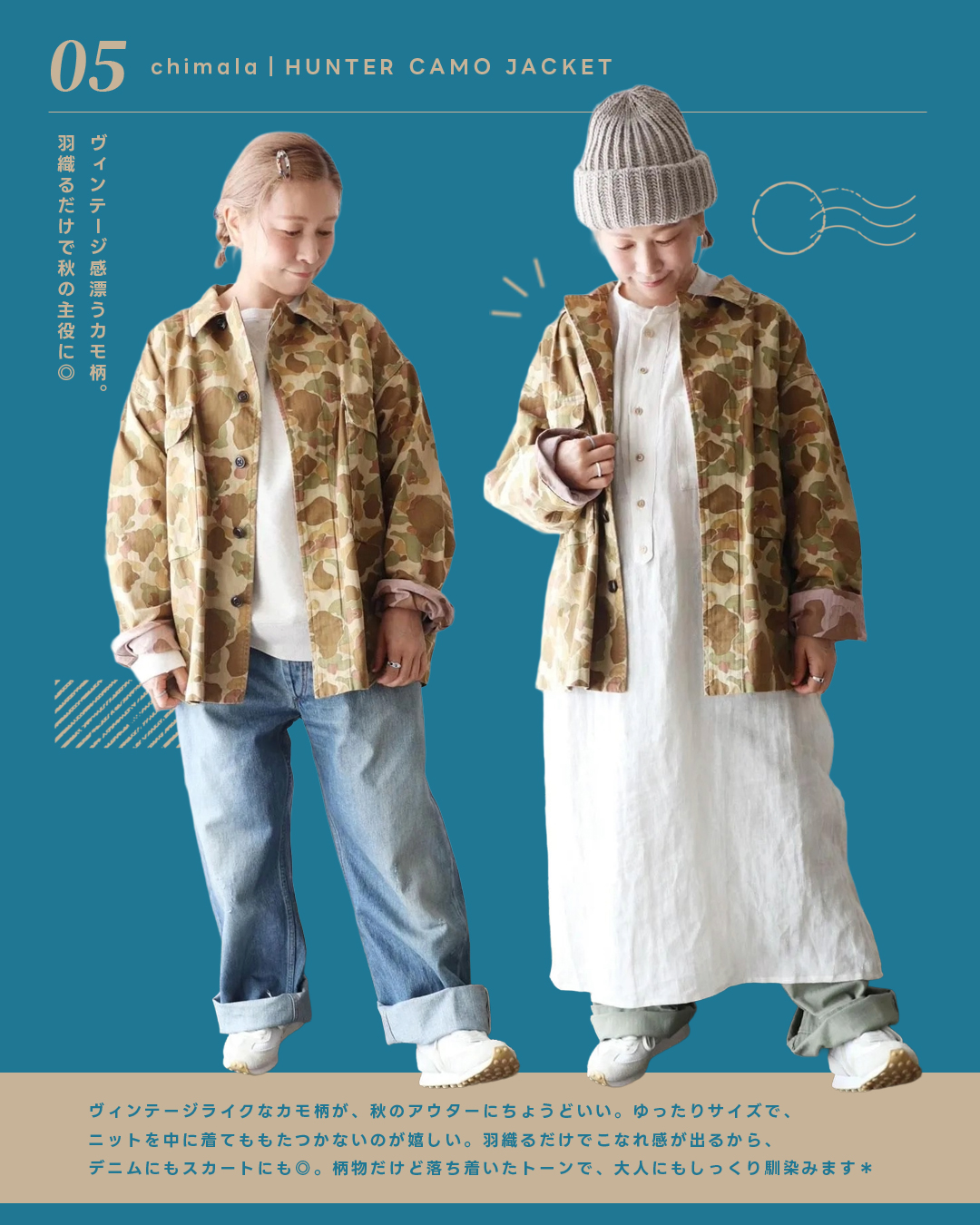 カモフラージュ柄のジャケットは、秋のアウターとして主役級の存在感。