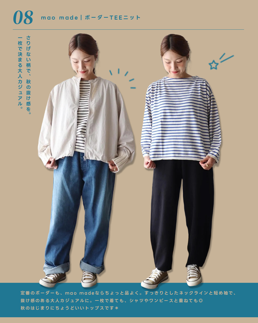 シンプルながらも品よく映える、mao madeのボーダーTEEニット。