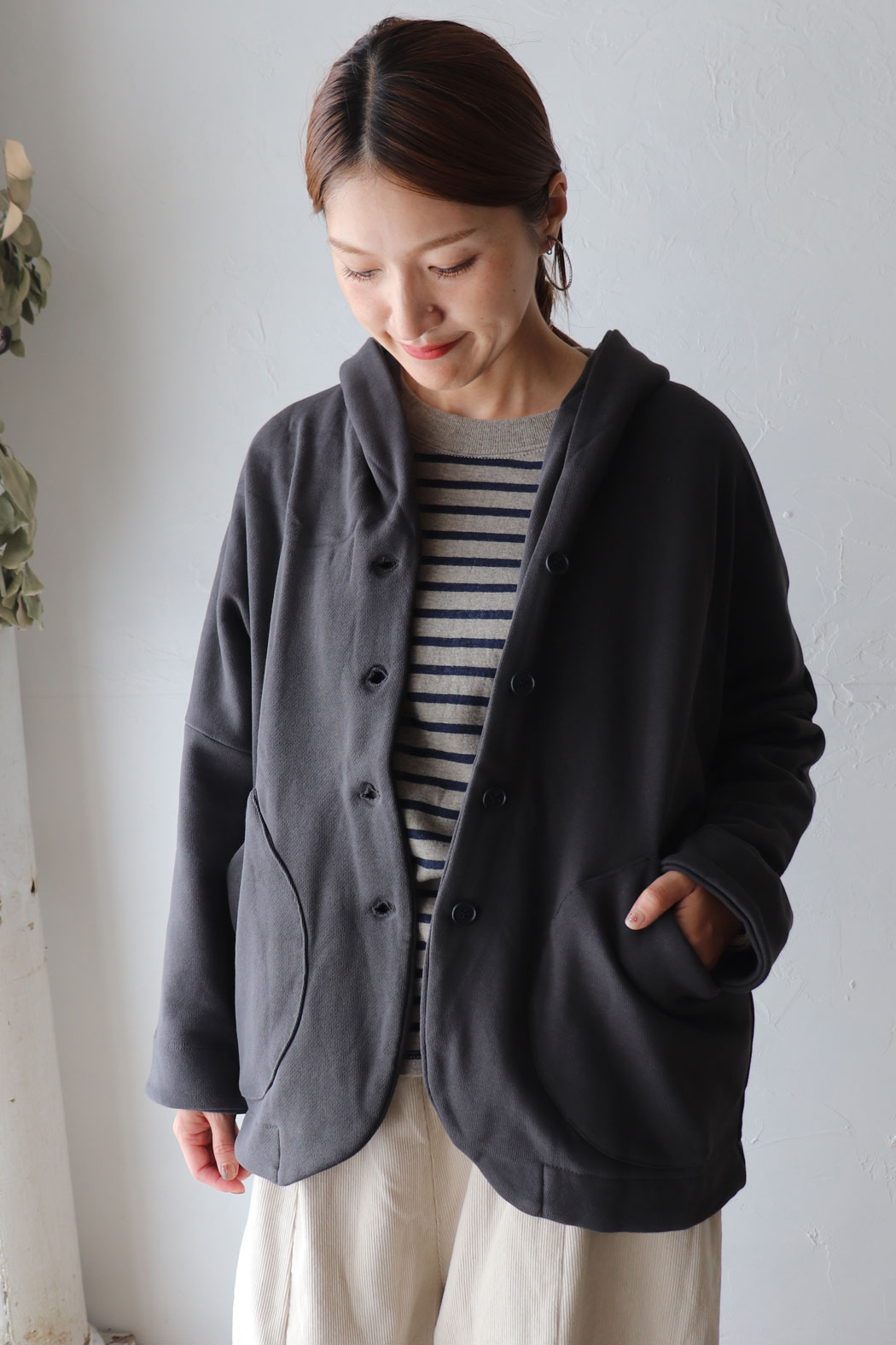 くすんだ色味が大人っぽい印象のジャケット。 しっかり厚みがあるので、コットンだけでも温かく、着心地抜群の1着* フードのようなボリュームのある衿元が可愛く、首回りをしっかりと包み込んでくれます。 たっぷり身幅とゆとりのある袖が抜け感のあるシルエットに〇