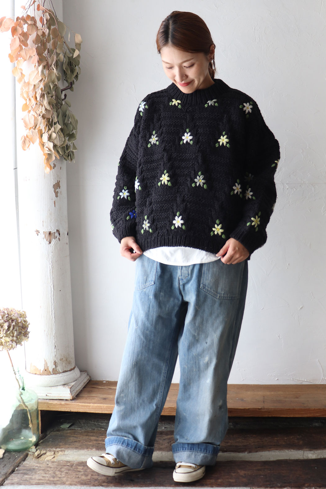 しっかりと厚みのあるハンドニットのプルオーバー。 風合い豊かな手縫いの可愛い花柄は、他にはない温かみのあるデザイン* ざっくりとした編地が立体感があり、1着で主役になれます。 たっぷりのボリュームが魅力で、真冬でもしっかりと温かいです。