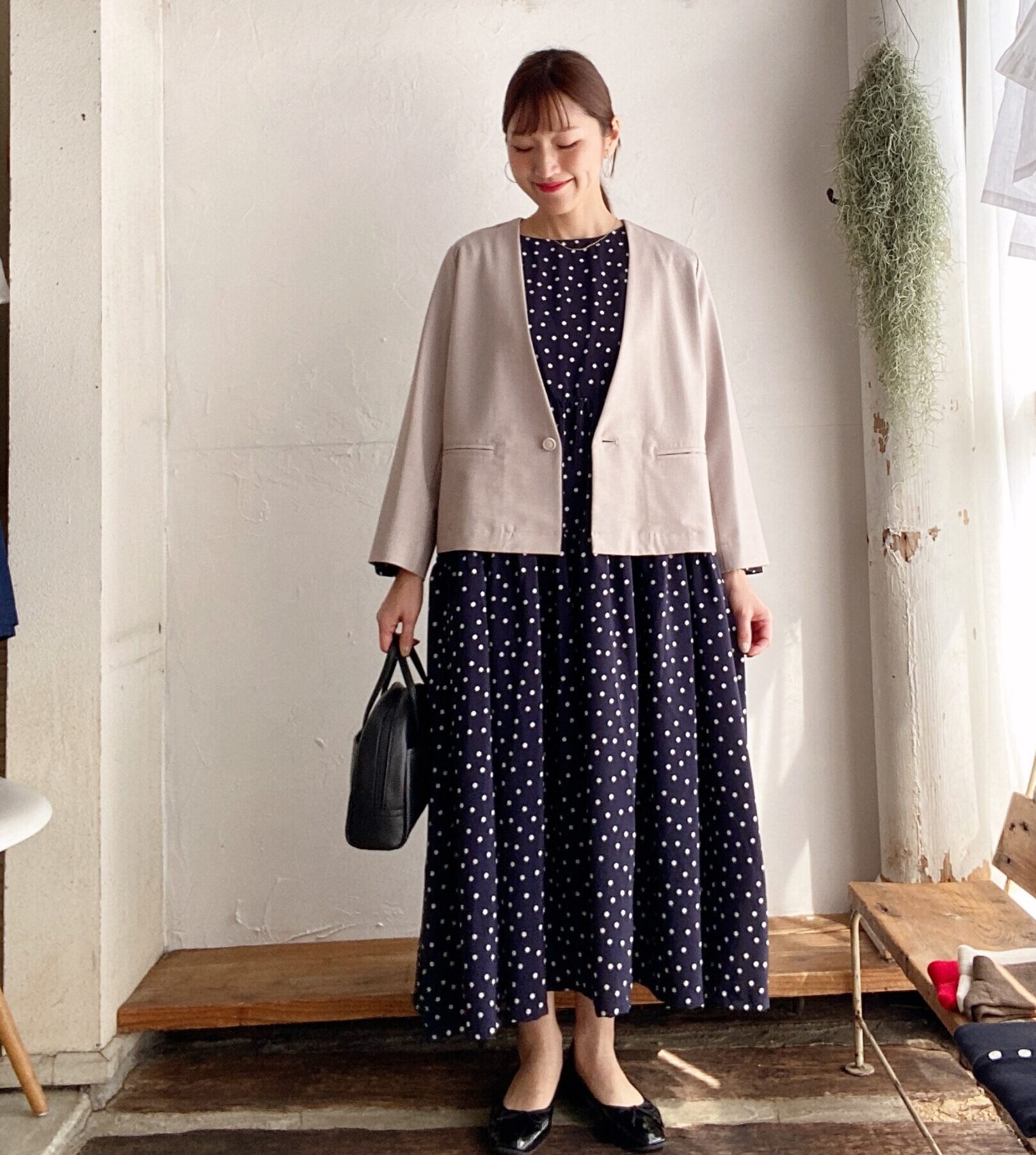 ネイビーベースのドット柄ワンピース。