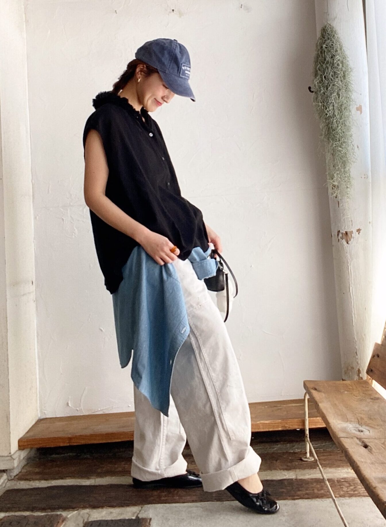 さっと羽織りやすいシャンブレーシャツを腰に巻いてみました。
