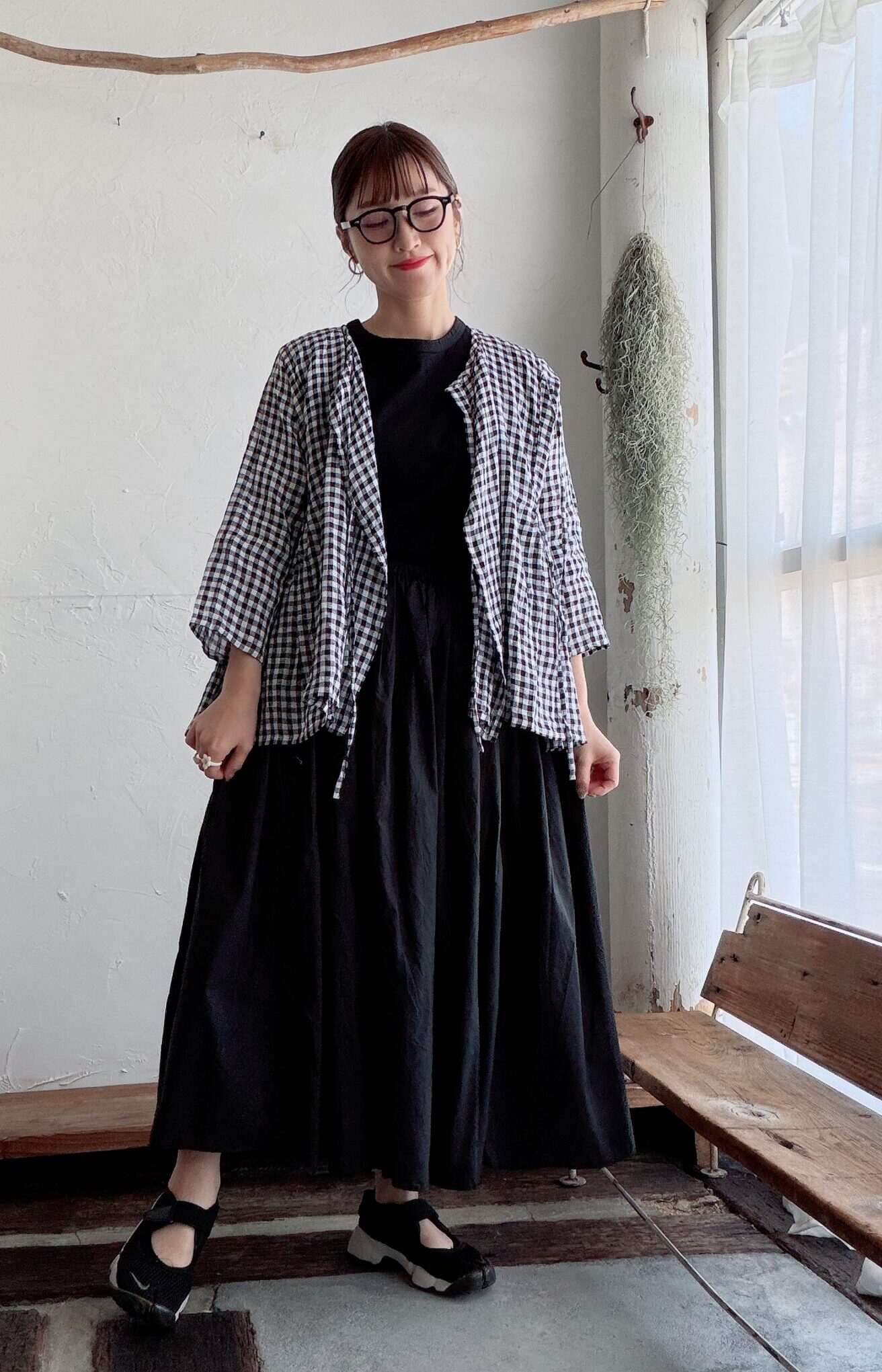 ギンガムチェックのカシュクールブラウスを羽織に。